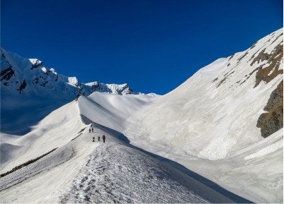 The trail becomes more scenic as you approach the high-altitude glacial lake of Ruinsara Tal. The clear blue waters of the lake are surrounded by meadows and snow-capped peaks, making this a perfect camping spot. Overnight stay in tents near Ruinsara Tal.